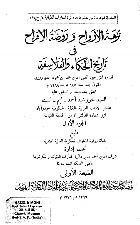 [1] Syams-ud-Dīn Muḥammad bin Maḥmūd Asy-Syahrazūrī, Nuzhat al-Arwāḥ Wa Rauḍat al-Afrāḥ Fī Tārīkh al-Ḥukamā’ Wa al-Falāsifah, vol. 1 (Hyderabad: Maṭba‘ah Majlis Dā’irat Al-Ma‘ārif Al-‘Utsmāniyyah, 1976 M/1396 H), hlm. 48.
