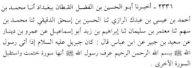 “Abū Husayn b. Faḍl al-Qaṭṭān informed us in Baghdad; Muḥammad b. Aḥmad b. ‘Īsā b. ‘Abduk al-Rāzī told us; Ḥusayn b. Isḥaq al-Daqīqī narrated to us; Muḥammad b. Sahm narrated to us; Mu‘tamir b. Sulaymān narrated to us; Ibrāhīm b. Zayd Abū Ismā‘īl narrated to us, from ‘Amrū b. Dīnār, from Sa‘īd b. Jubayr, from Ḥaḍrat Ibn Abbāsra, he said: When Jibrīlas delivered to the Holy ProphetSAW bismillāh al-raḥmān al-raḥīm, he became aware that one sūra got finished and he would receive a new one.”8