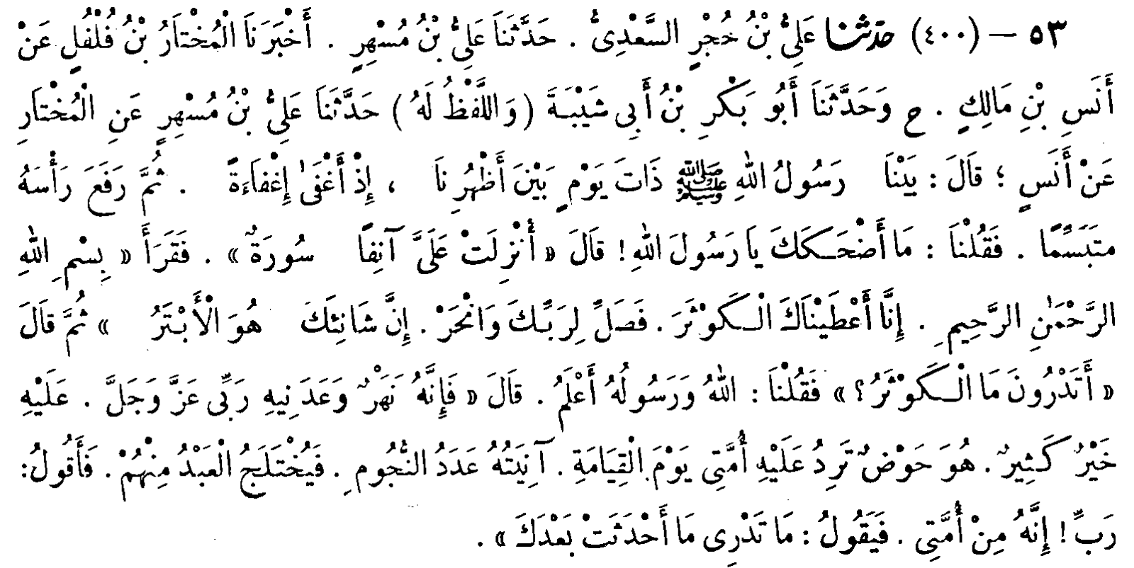 “‘Alī b. ujr al-Sa‘dī narrated to us; ‘Alī b. Mushir narrated to us; al-Mukhtār b. Fulful informed us, from arat Anas b. Mālikra. And Abū Bakr b. Abī Shayba (this redaction belongs to him); ‘Alī b. Mushir narrated to us, from al-Mukhtār b. Fulful, from arat Anasra, he said: Once upon a day, in front of us, arat RasūlullāhSAW slumbered in a comfortable manner. Afterward, he raised his head up whilst smiling. We, thus, asked: What did cause you smile, O RasūlullāhSAW? He replied: A sūra was just now descended to me: In the name of Allah, the Gracious, the Merciful. Surely, We have given to thee abundance of good. So pray to thy Lord, and offer sacrifice. Surely, it is thy enemy who is without issue. Afterward, he asked: Do you all know what al-kawthar is? We replied: Allah and His Messenger know more. He said: This is verily a river which my Lord has promised for me. Therein is abundant good. That is a pond which my people will attend in the Day of Judgement. Its cup is the amount of stars. Subsequently, one servant among them will be forced out. I will, therefore, respond: My Lord! Isn’t he among my people? He will, thus, reply: You did not know what happened after your demise.”6