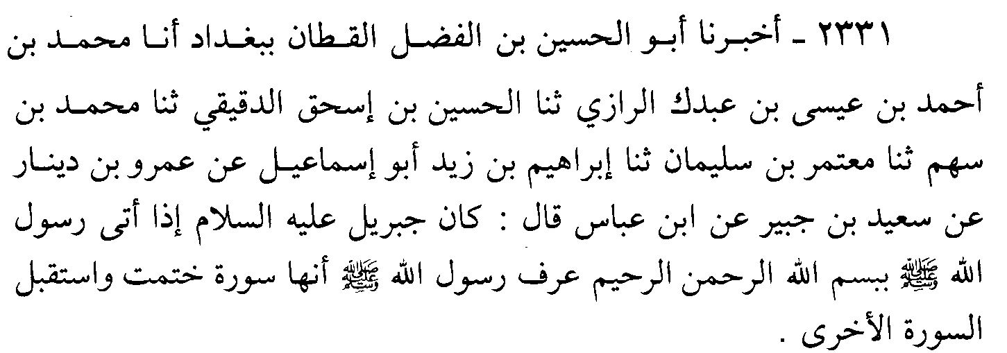 “Abū Husayn b. Fal al-Qaṭṭān informed us in Baghdad; Muammad b. Amad b. ‘Īsā b. ‘Abduk al-Rāzī told us; usayn b. Isaq al-Daqīqī narrated to us; Muammad b. Sahm narrated to us; Mu‘tamir b. Sulaymān narrated to us; Ibrāhīm b. Zayd Abū Ismāīl narrated to us, from ‘Amrū b. Dīnār, from Sa‘īd b. Jubayr, from arat Ibn Abbāsra, he said: When Jibrīlas delivered to the Holy ProphetSAW bismillāh al-ramān al-raḥīm, he became aware that one sūra got finished and he would receive a new one.”8