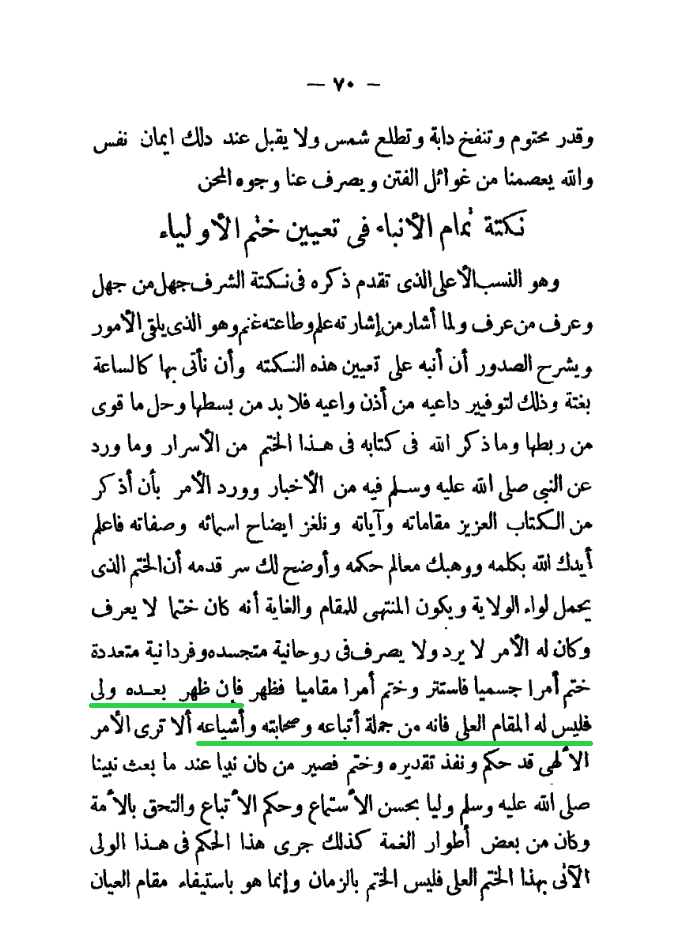 Sesudah ‘Īsāas datang selaku Khātam al-Auliyā’, tidak akan ada lagi seorang wali, kecuali dari ia yang bermuasal dari Jamaah beliau. Syaikhrh menjelaskan: