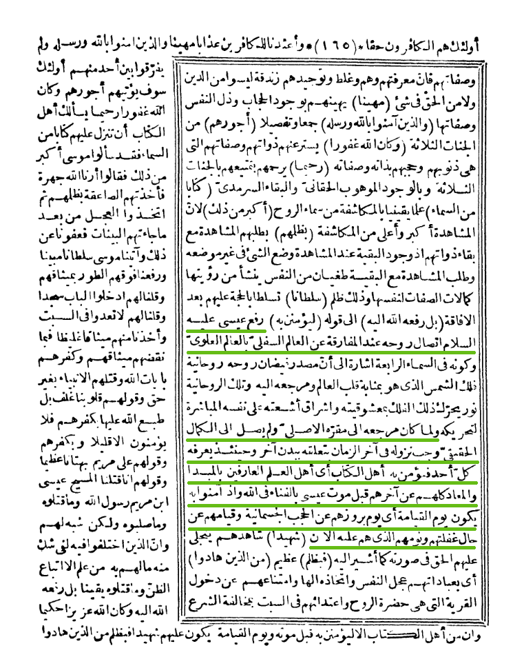 “Pada saat itu, setiap orang akan mengenali beliau dan ahli kitab, yakni ahli ilmu yang arif akan awal dan akhir dunia, pada akhirnya akan beriman kepada ‘Īsā sebelum beliau wafat melalui fanā’ fillāh. Begitu mereka beriman, hari kiamat pun akan kerjadi, yakni hari terlepasnya mereka dari tabir-tabir jasmani serta bangkitnya mereka dari keadaan lalai dan tidur yang tengah mereka alami sekarang.”9